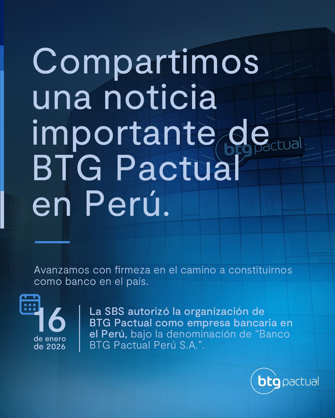 El 16 de Enero de 2026, la Superintendencia de Banca, Seguros y AFP autorizó la organización de Banco BTG Pactual Perú S.A. Este hito marca un avance clave en nuestra evolución en el país y refuerza nuestra visión de largo plazo.